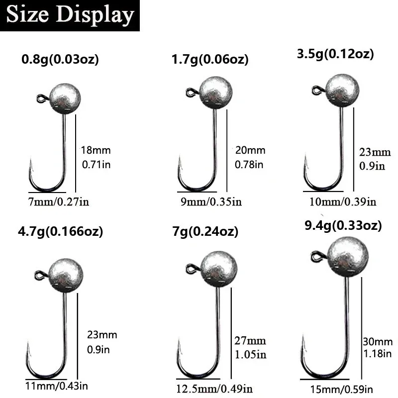 10pcs/lot 0.8g 1.7g 3.5g 4.7g 7g 9.4g Jig Head Fishing Hook Round Ball Jig Head Fishhook Soft Worm Fishing Accessories